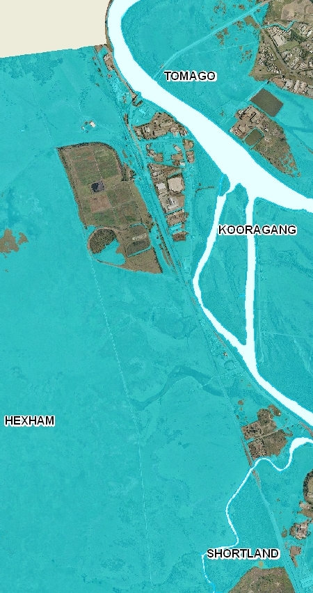 - Hexham Park shows as completely inundated on OzCoasts map for the impacts of 110 cm sea level rise, together with most of the surrounding district – including a section of the Pacific Highway and a substantial section of the main north railway.